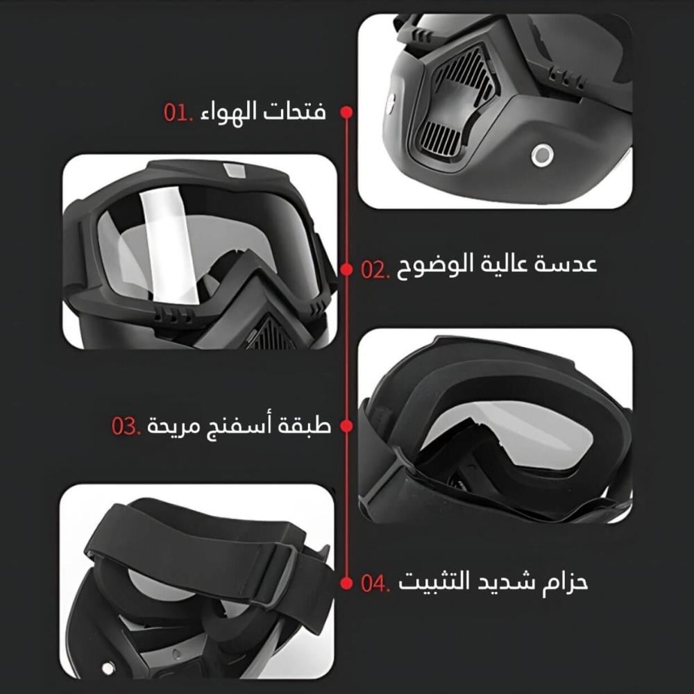 قناع موتوكروس بنظارات واقية من الشمس لركوب الدراجات والسكوترات : قناع موتوكروس الشهير يأتي بنظارات واقية من أشعة الشمس وبطبقة مبطنة من الداخل لراحة أكبر أثناء أرتداء قناع الوجة المخصصة لركوب الدراجات والسكوترات