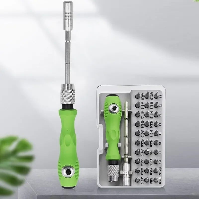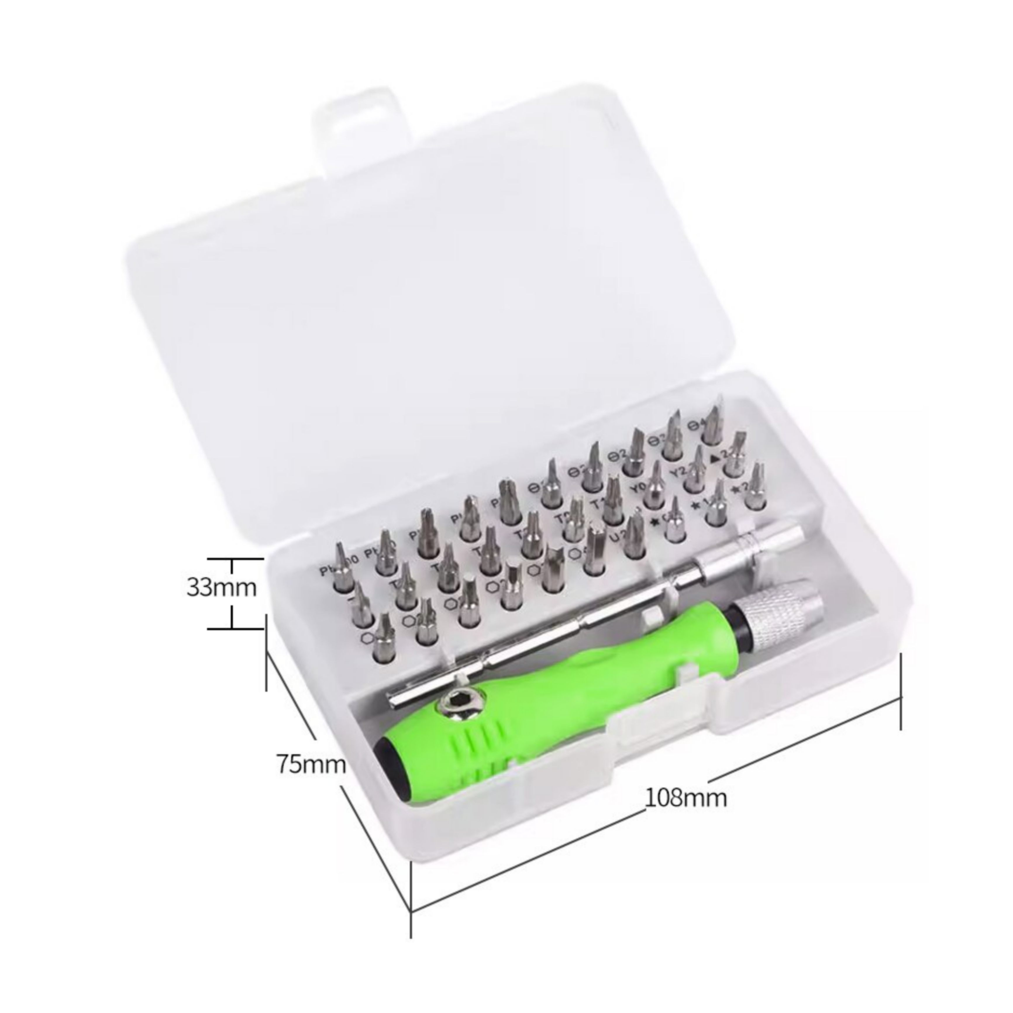 طقم عدة مكون من 32 قطعة بعلبة : قم بالعديد من الوضائف كشد المسامير وفكها وأصلاح الأجهز التي يصعب الحصول على مفك مخصص لها ، طقم مكون من 32 قطعة تشمل أهم الأشياء إلتي تحتج إليها